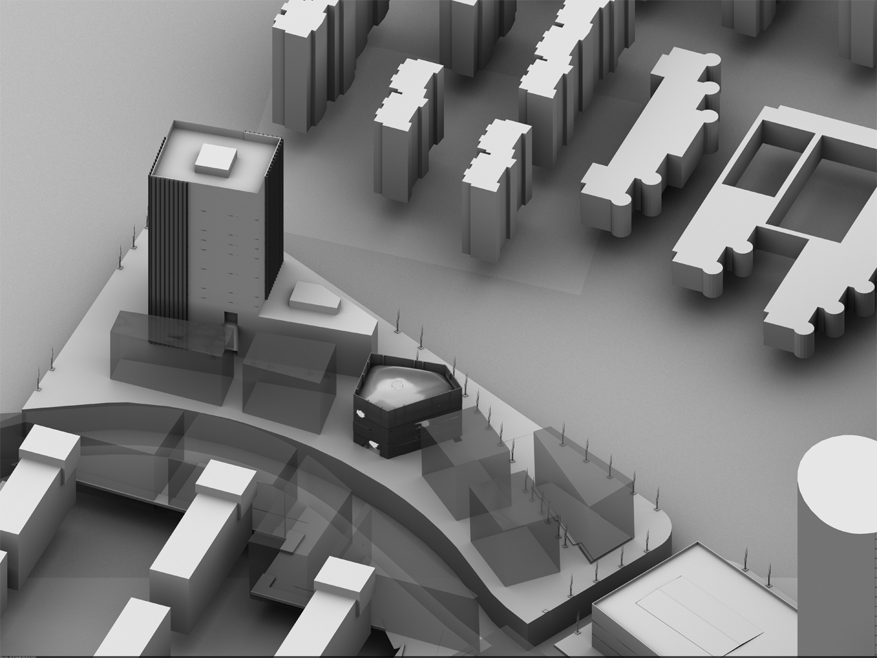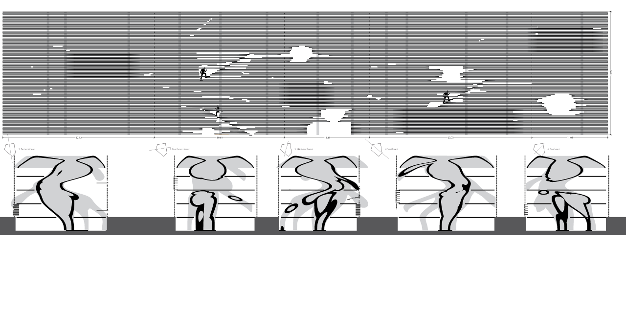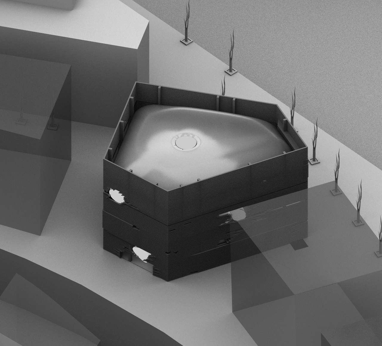 Metaphase, a step in the cellular reproductive process of mitosis, is characterized by an alignment of like parts. During this phase, a cell’s chromosomes line up in order to divide equally as the cell splits into two. This metaphase condition is present in the project at multiple scales. The larger scale is represented by a large internal structure, which serves as internal structure, light source, and definition of the building's character. Not unlike chromosomes, the tubular branches are in the process of separating. The smaller scale occurs in the skin, where the louvered external skin splits and breaks at key interventions, namely the staircases, the individual bars, and the moments of chromosome tube breaches.