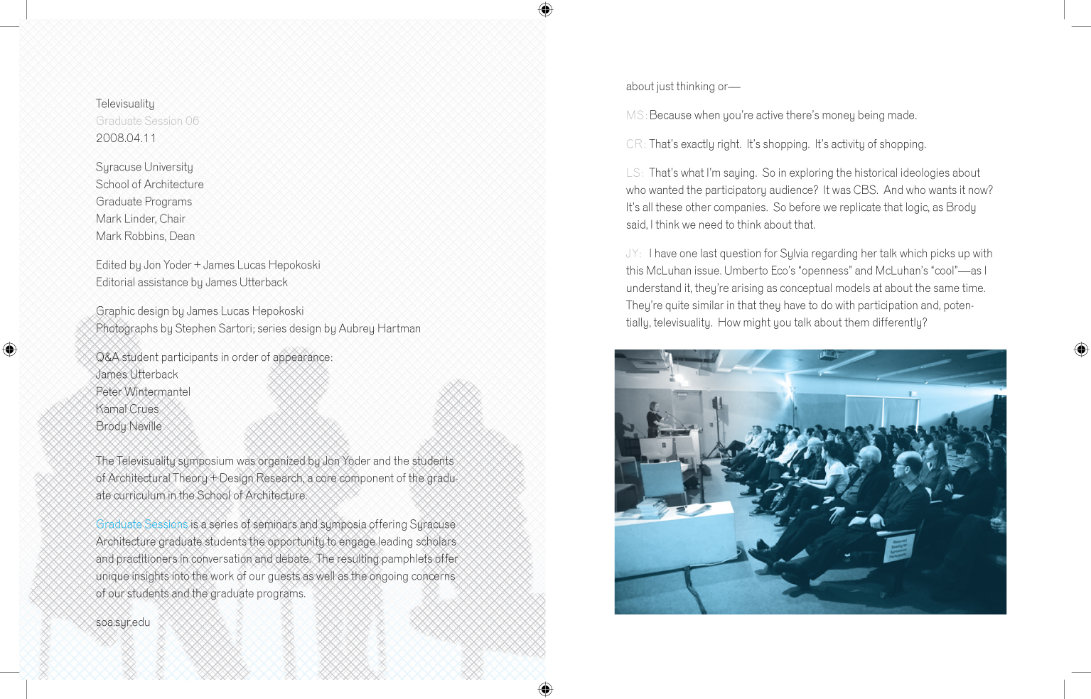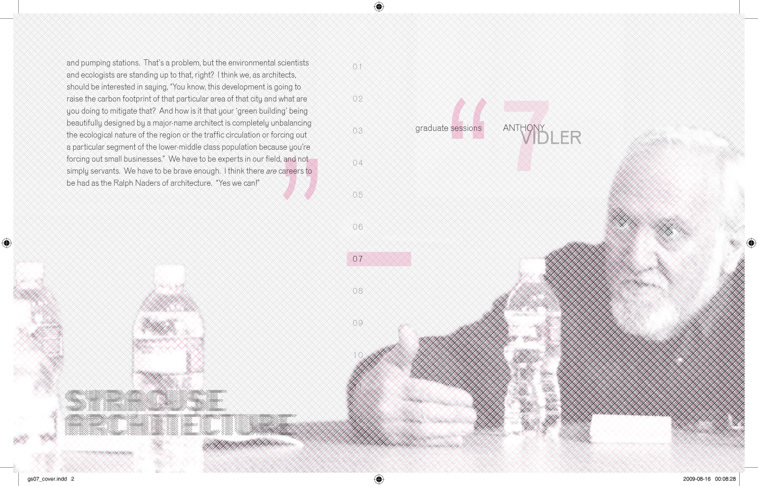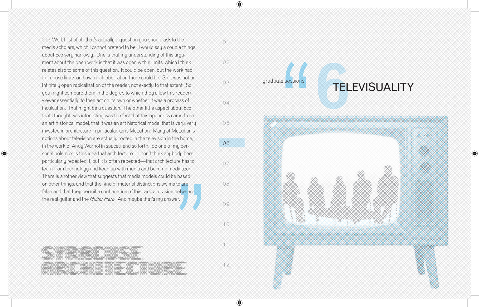 Graduate Sessions is a series of seminars and symposia offering Syracuse Architecture Graduates students an opportunity to engage leading scholars and practitioners in conversation and debate. The resulting pamphlets offer unique insights into the work of the school's guests as well as the ongoing concerns of the graduate program and its students.